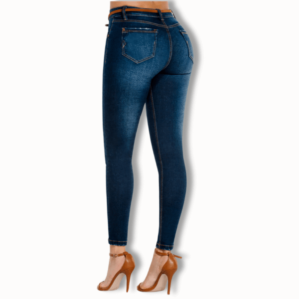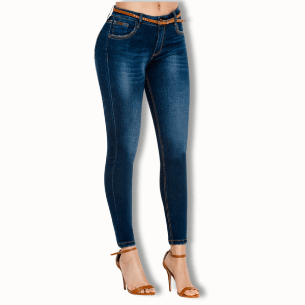 Jean tiro alto tipo skinny, tono oscuro con bolsillos funcionales en el frente. Tiene cortes y bolsillos funcionales con cortes en el posterior. Resalta lo mejor de tu cuerpo con excelente calidad.