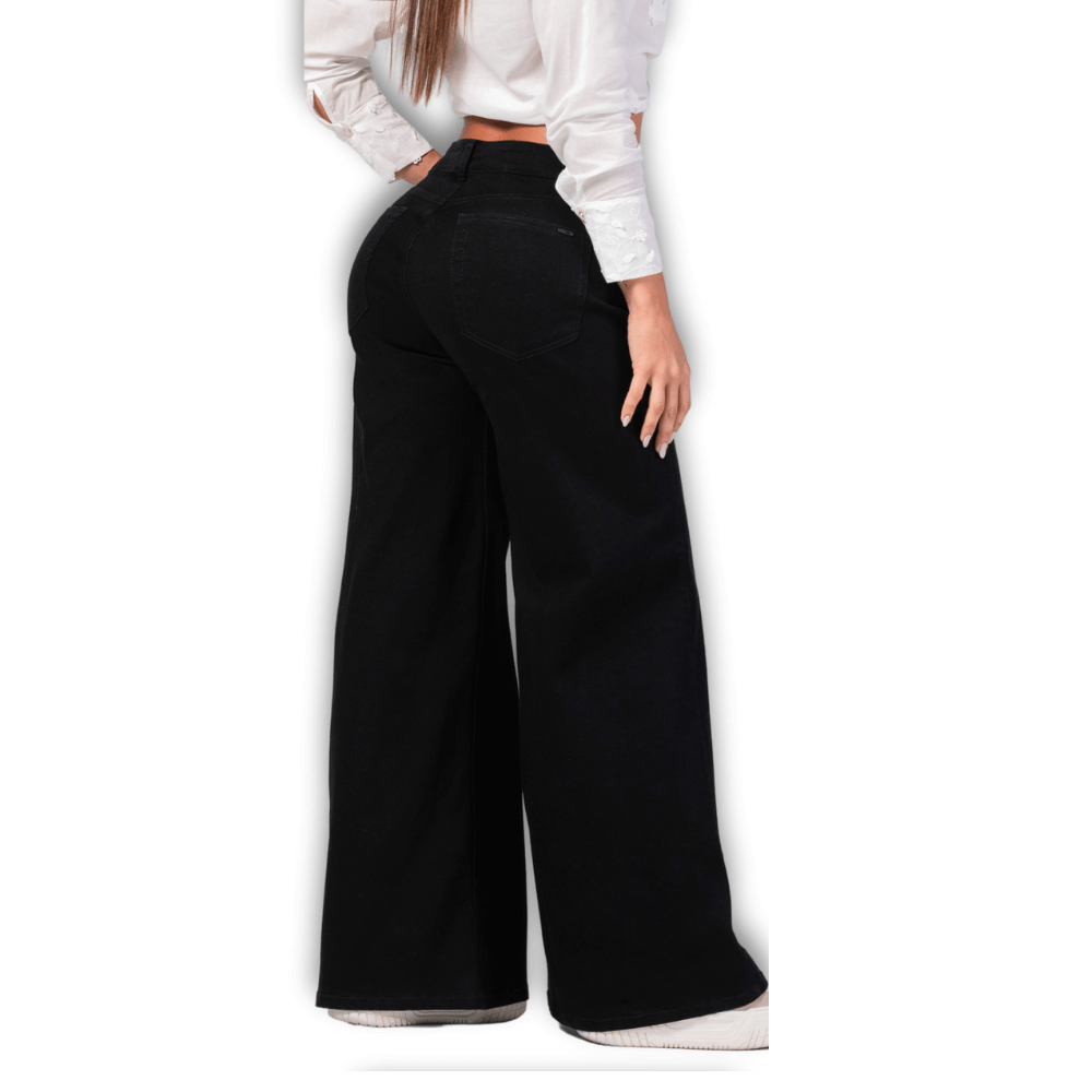 Este jeans palazzo negro combina un diseño moderno con la suavidad y elasticidad del denim colombiano. Su tiro alto realza la cintura y alarga visualmente las piernas, logrando una silueta estilizada sin sacrificar tu comodidad.