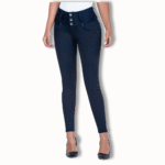 Jean fajisculpture (faja interna) reductor tipo skinny tono azul oscuro con pretina de tres botones y bolsillos funcionales en el frente. Tiene recogido en el posterior de la pretina, cortes, pinzas y bolsillos funcionales en el posterior.