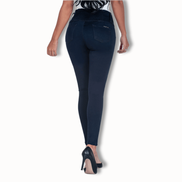 Jean fajisculpture (faja interna) reductor tipo skinny tono azul oscuro con pretina de tres botones y bolsillos funcionales en el frente. Tiene recogido en el posterior de la pretina, cortes, pinzas y bolsillos funcionales en el posterior.