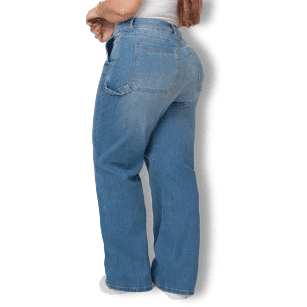 Si te gustan los jeans que realzan tus curvas y además son cómodos… este wide leg azul claro para talla grande te va a encantar. Tiene un calce relajado desde la cadera hasta abajo, con un corte recto y suelto que estiliza sin apretar. 💙