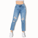 Cómodo Mom Jeans colombiano en tono azul medio con destroyed, tiro alto, efecto levantacola/push up. Bolsillos funcionales en el frente y posterior. Una prenda de mucha tendencia.