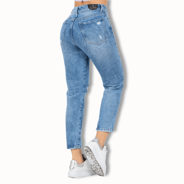 Cómodo Mom Jeans colombiano en tono azul medio con destroyed, tiro alto, efecto levantacola/push up. Bolsillos funcionales en el frente y posterior. Una prenda de mucha tendencia.